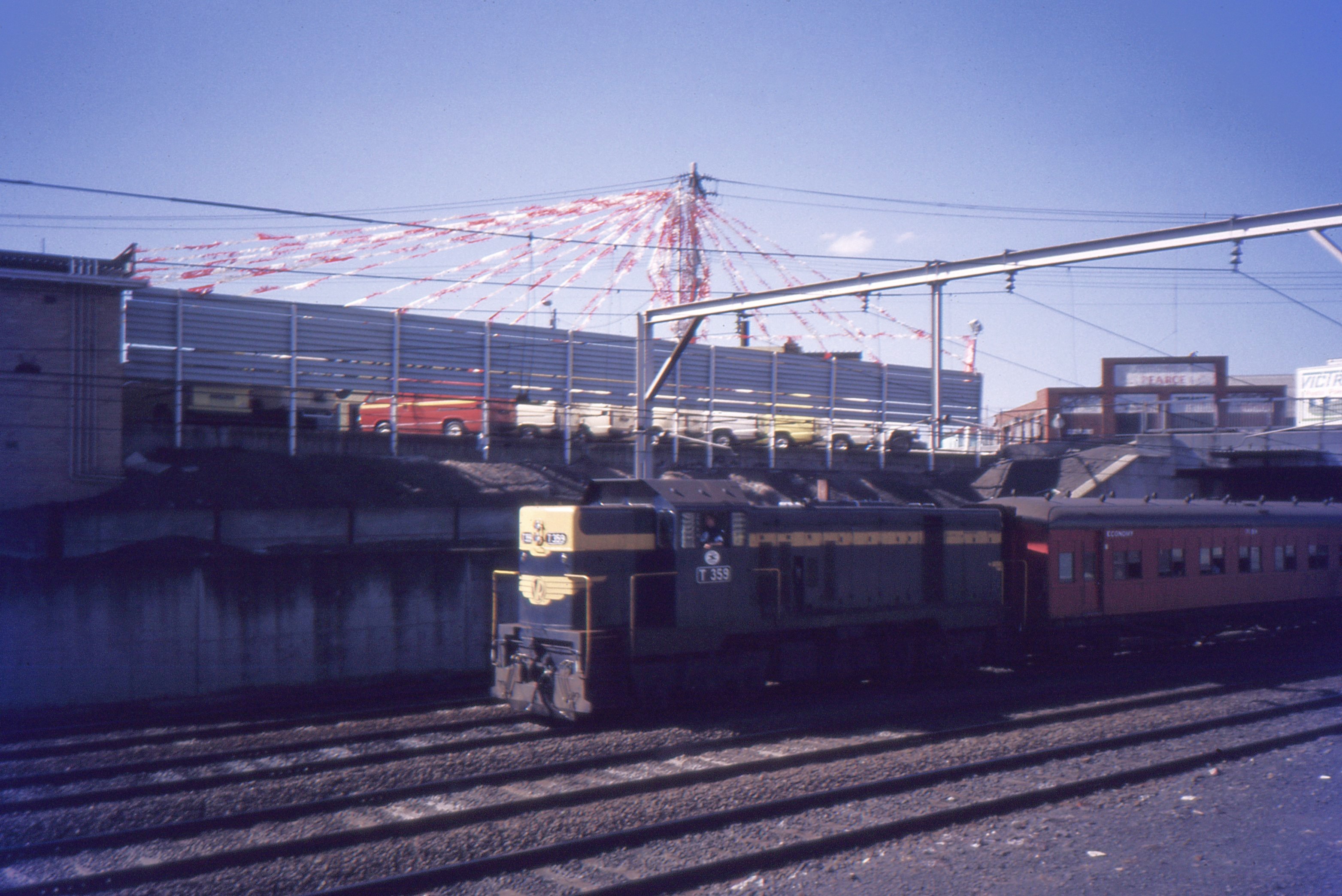 Loco T359 was one of Victorian Railways' fleet of 95 EMD-engined T class diesel electric locomotives. Delivered in seven tranches between 1955 to 1968, these versatile 8 cylinder diesel Bo-Bo units cam in many variations of body shape, mechanical and electrical innards. T359 is a high-nose variant and was delivered in 1962 as one of the third tranche. She was withdrawn in 1989 and scrapped in 1992.
