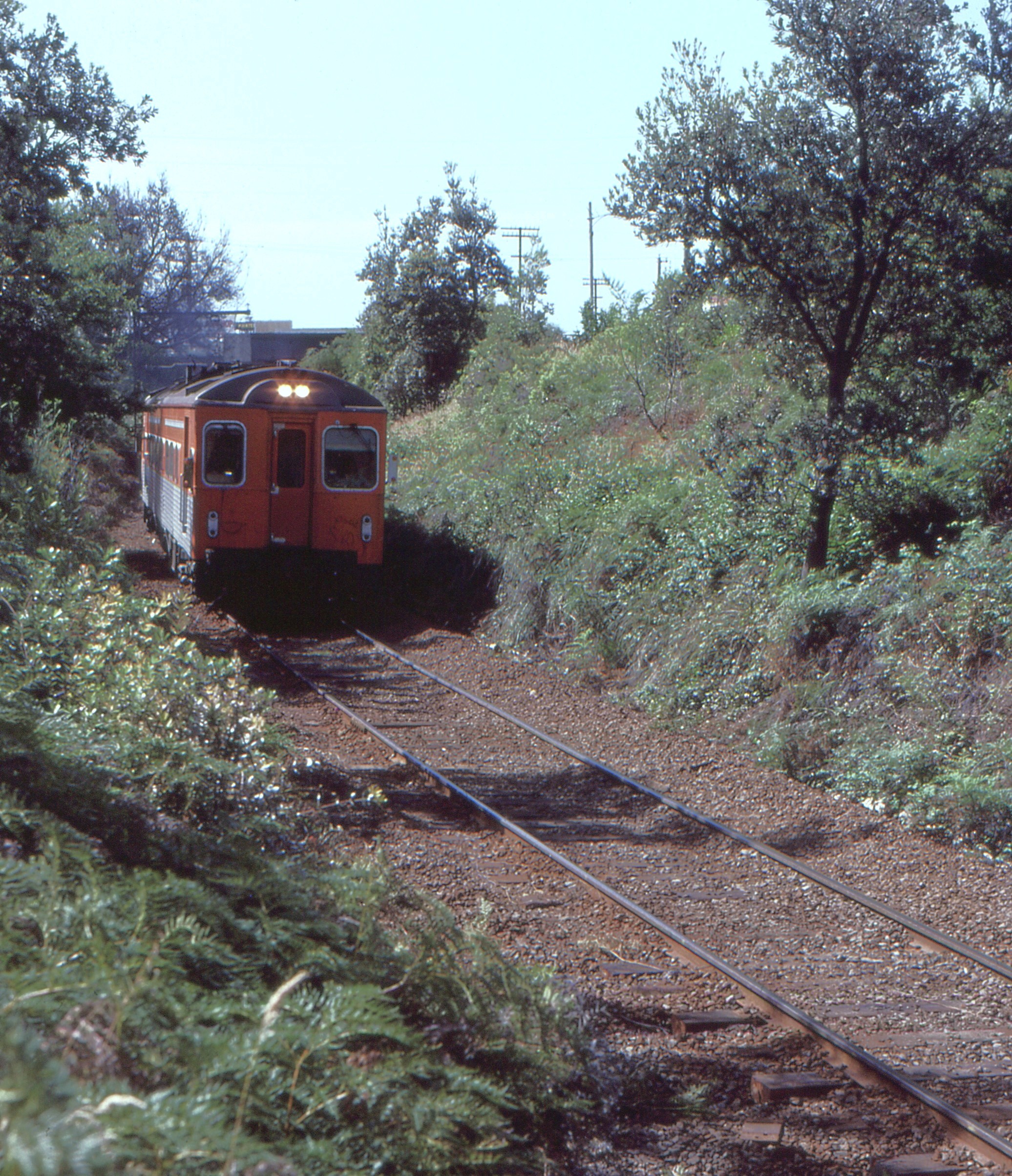 The Stony Point line serves the Eastern side of the Mornington Peninsula south of Melbourne. It operates as a shuttle connecting at Frankston with electric trains to and from Melbourne. You can just see the very last overhead electric stanchion just behind the train as it leaves electrified territory. In 1986 the service was operated by DRC railcars such as the one photographed. Since then the service has been provided by A class locomotives hauling passenger carriages, and today the service continues as a Sprinter railcar service.